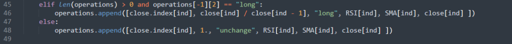 In the image below we see the condition: len(operations) > 0 and operations[-1][-2] == “long” that will add data into the list operations until there is not a new sell signal.
