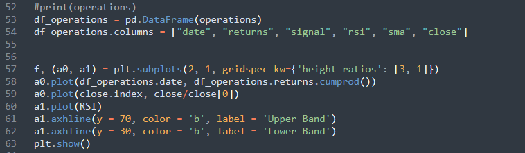 Finally, it is time to review the code for creating the equity curve of our strategy. This is the cumulative return for Wal-Mart and the RSI. But first, we show the list operations to a pandas data frame and add the name of each column. Then we add the code to plot our variables of interest: