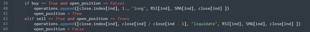 We will add data to our list operations when the variable buy is True and at the same time, open_position is False, while we will close our position when sell is True and open_postion is True.