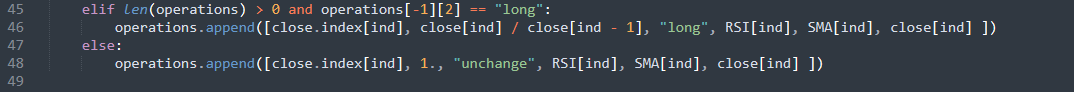 In the image below we see the condition: len(operations) > 0 and operations[-1][-2] == “long” that will add data into the list operations until there is not a new sell signal.