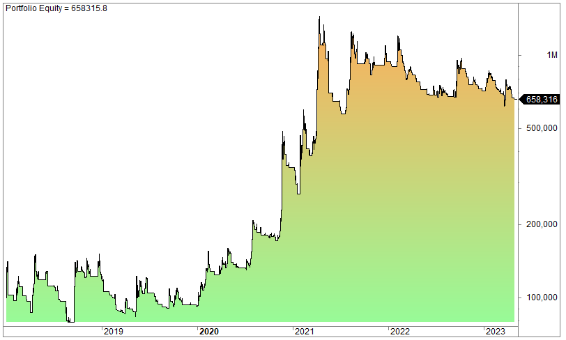 As you can see, the strategy’s performance is pretty erratic and far from something we would like to trade. It makes money in bull periods but mostly shows a flat performance. The annual return is 42%, and the average gain per trade is 2.59%. This is, of course, good, but it all happened over a couple of years.