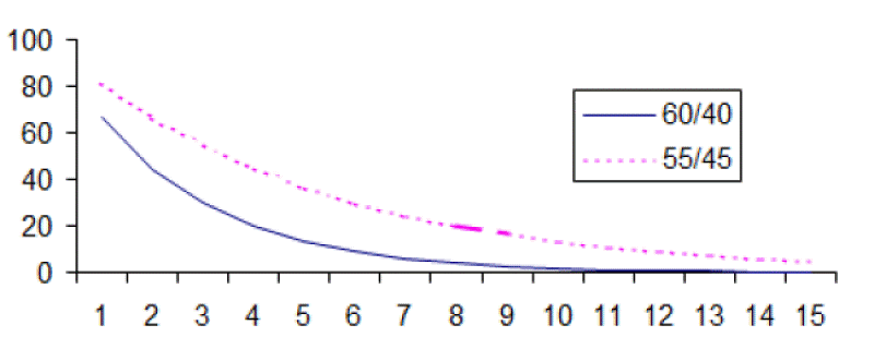 Risk of ruin is hence 54.2% after five trades (40+9.6+2.3+2.3).
