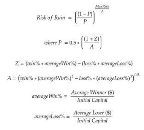The risk of ruin in trading can be calculated by using specific formulas that require some assumptions. The formulas are not perfect, but they are approximations.