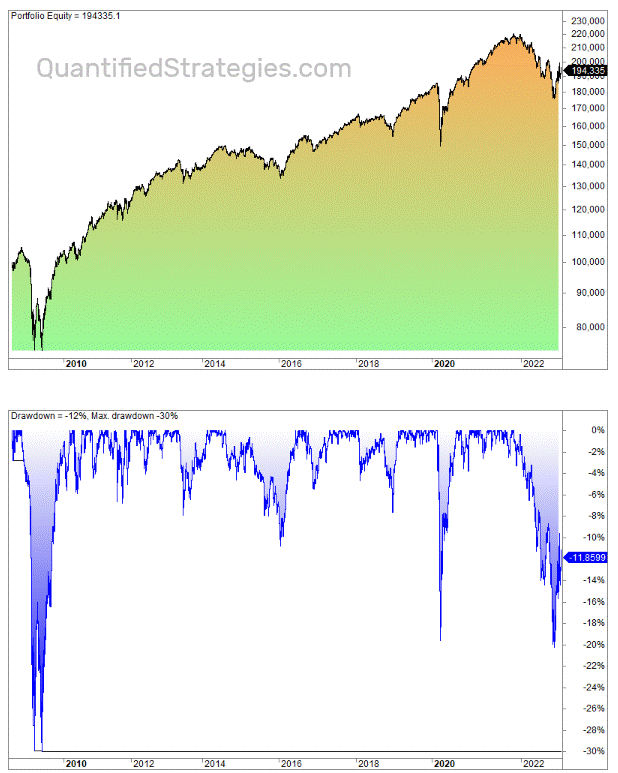 The annual return over the period is a low 4.4% including dividends reinvested. On the positive side, the max drawdown is 30%, significantly lower than for the stock market (55%).