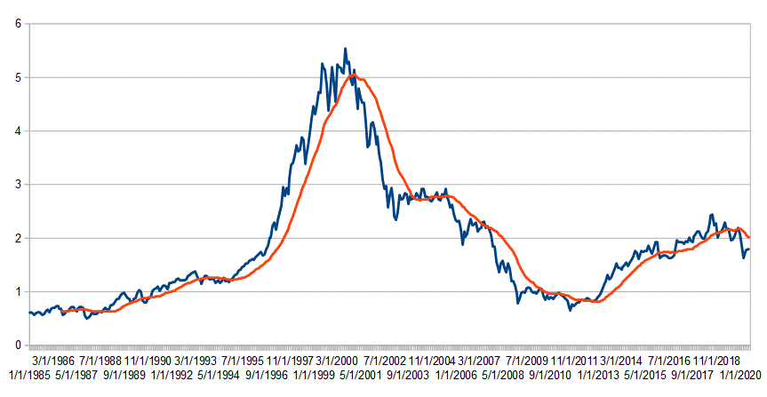 The ratio and its moving average looks like this: