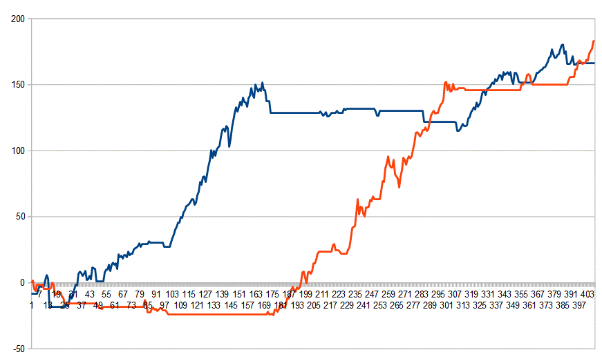 It turns out it’s pretty equal. The chart above shows the accumulated percentage gains divided by each asset: