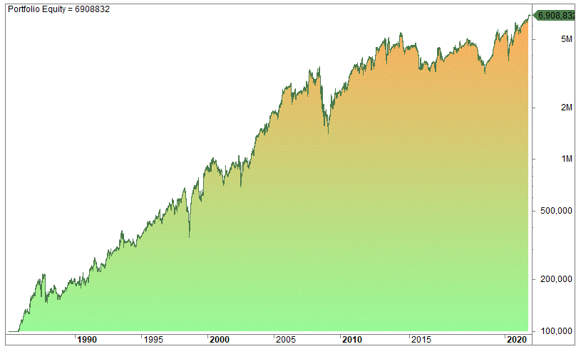 We start with 100 000 and let it compound for 35 years. The CAGR is 12.3% and the max drawdown is 59% (in GFC 2008/09). The CAGR is better than the 10% dividend reinvested return for the S&P 500. Bear in mind that the CAGR of the strategy is higher if we had reinvested the dividends.