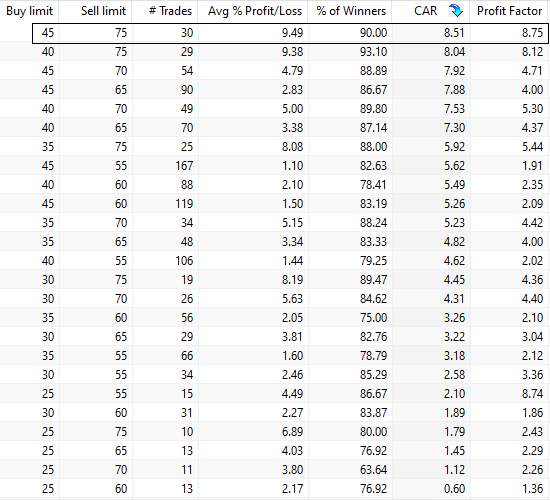 When we run the backtest, we get the following table for S&P 500 when we rank the results on annual returns (CAR):