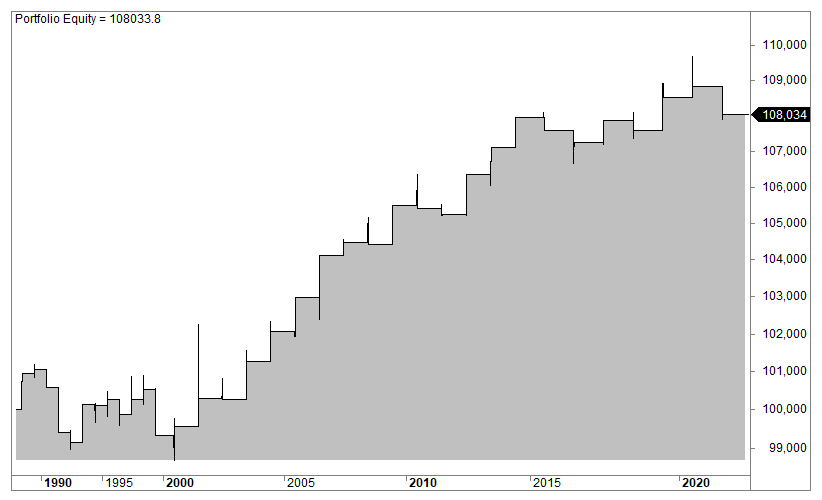 The backtest is pretty simple. We test on free data from Yahoo/finance by using the tickercode ^RUT which is the cash index of the Russell 2000 and doesn’t include dividends.