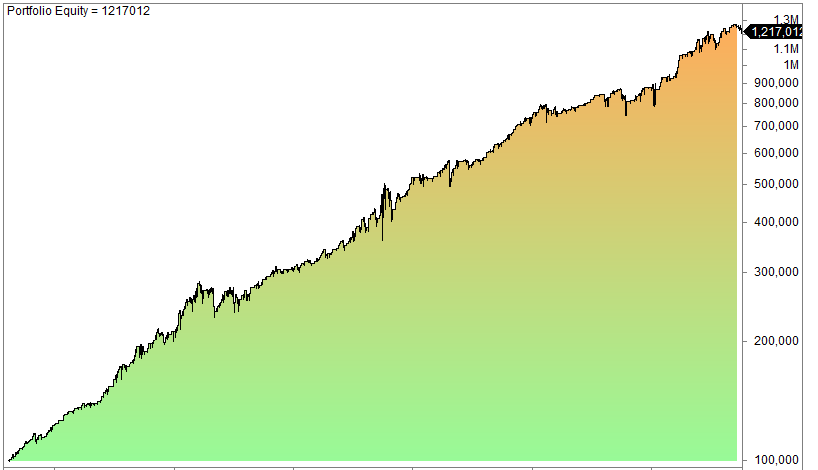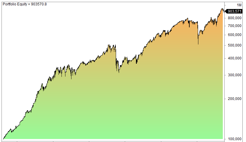 The equity curve (the equity curve is the visual or graphical representation of your equity) of this simple strategy looks like this since SPY’s inception in 1993: