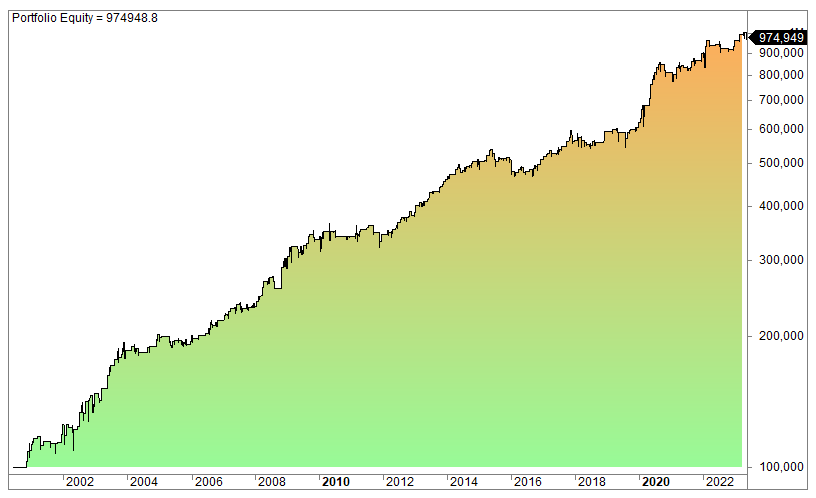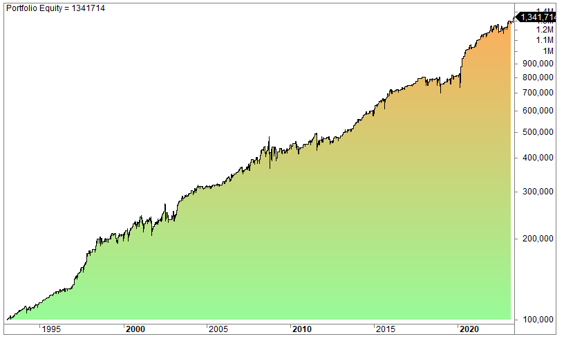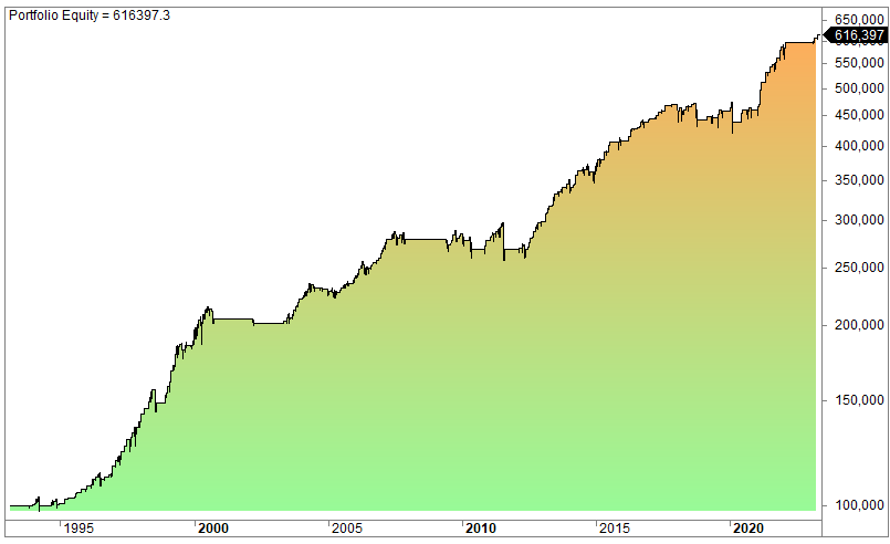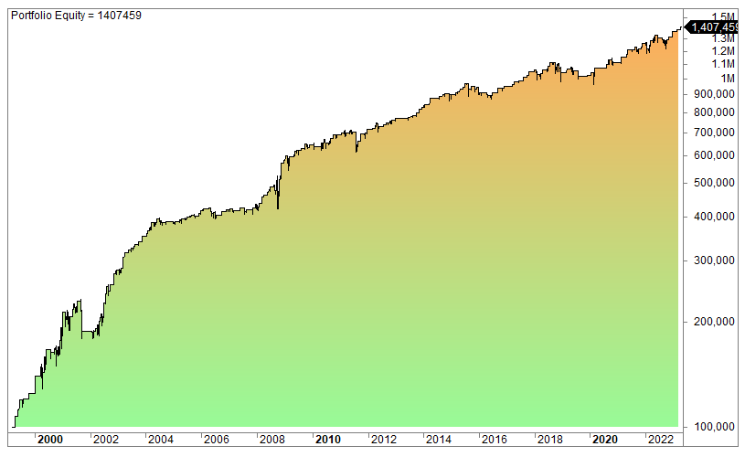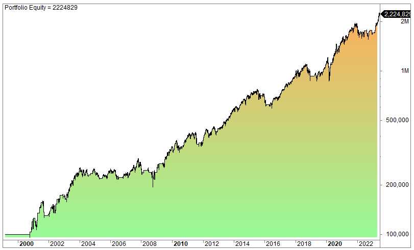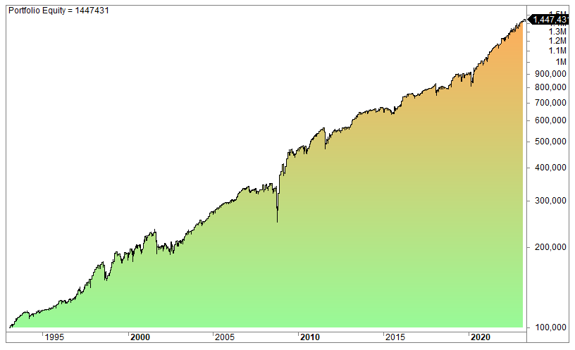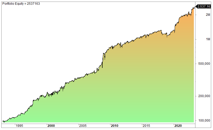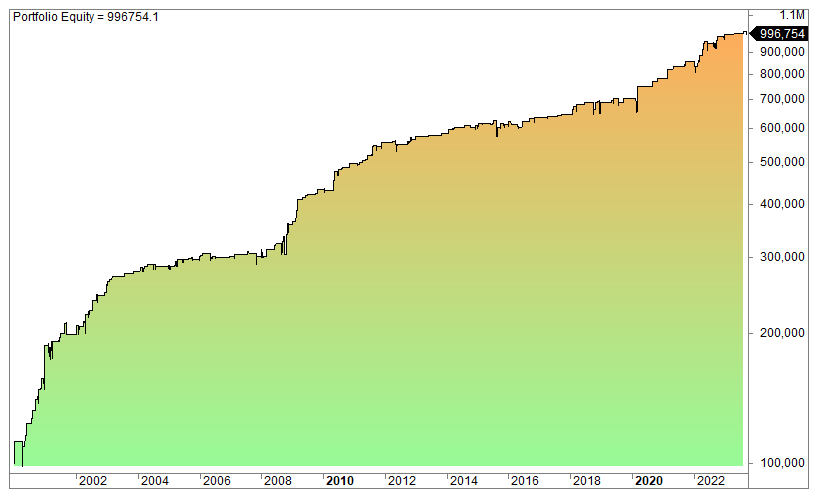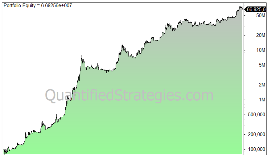 The equity curve (log scale):