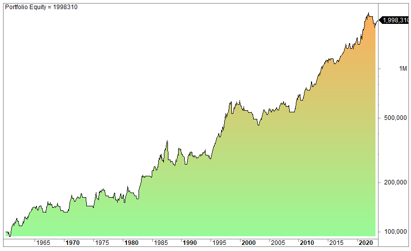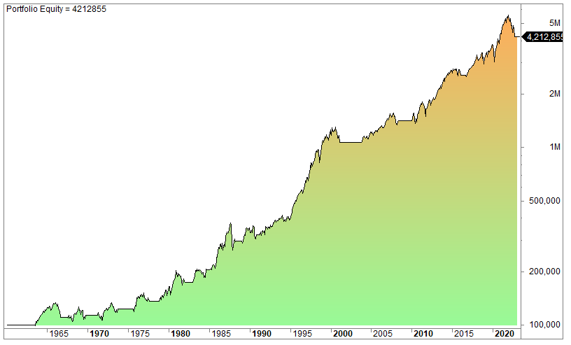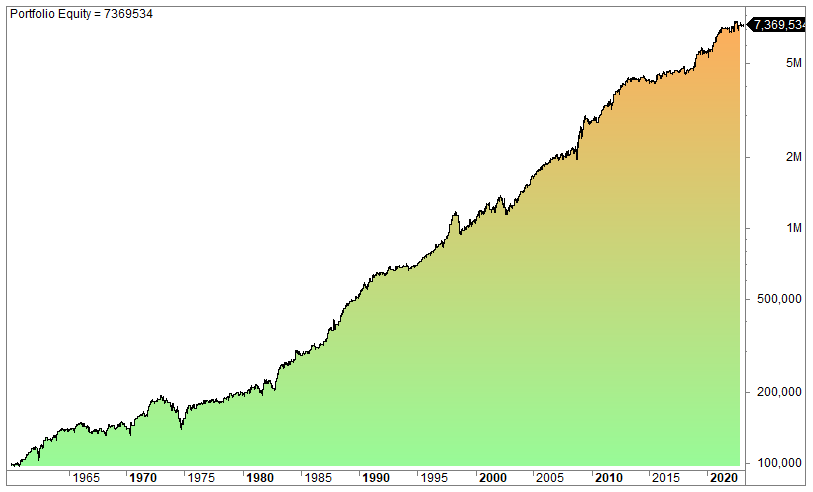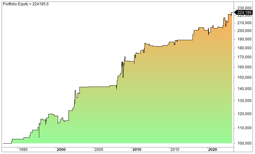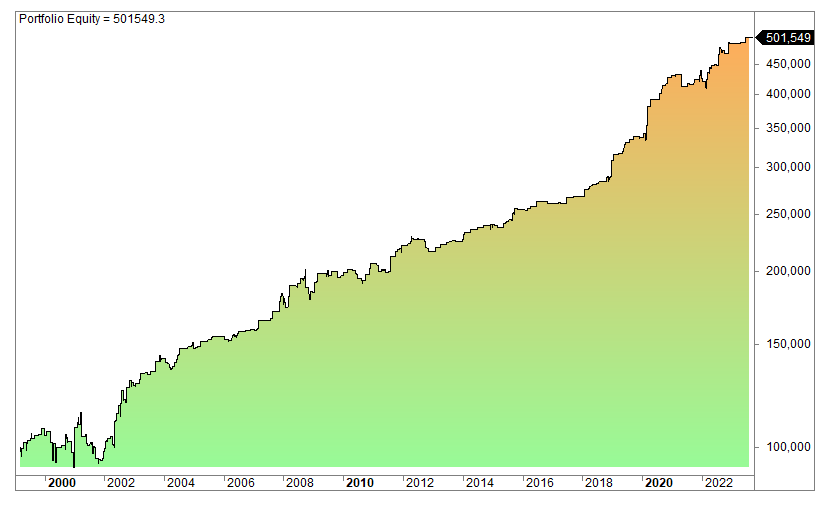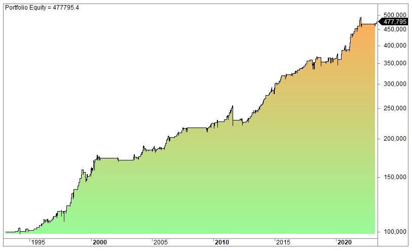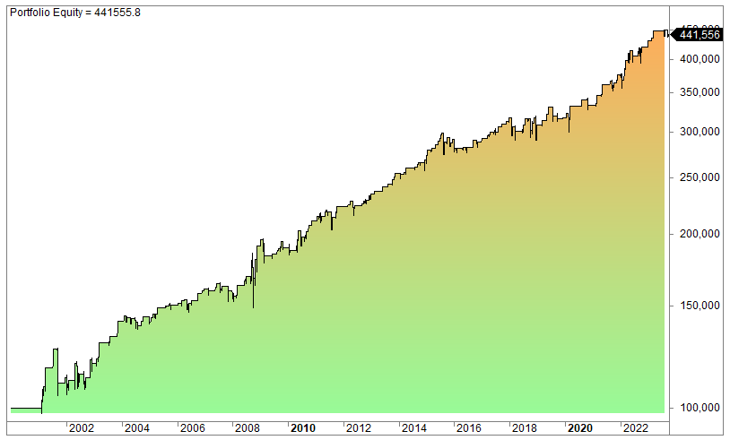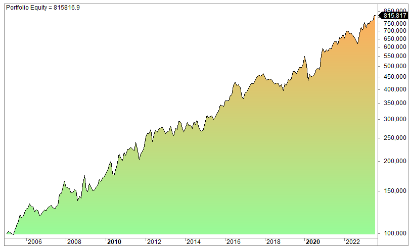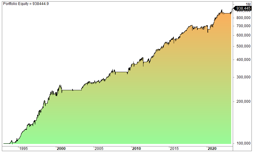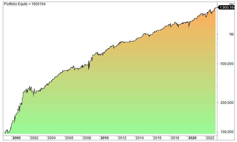 The equity curve (log scale):