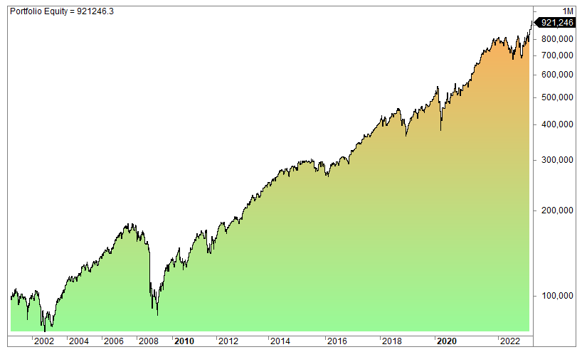 The equity curve (log scale) in SPY: