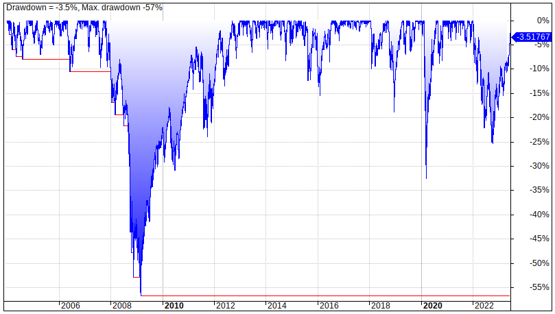 The portfolio’s underwater curve (drawdowns, i.e., decline in value from a relative peak value to a relative trough):