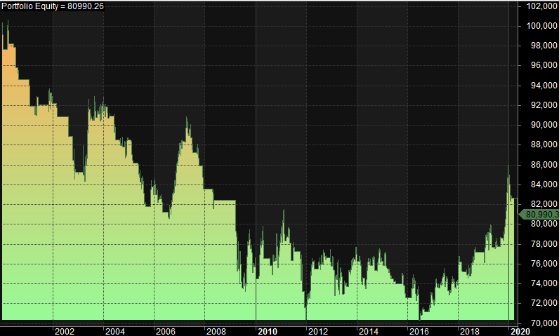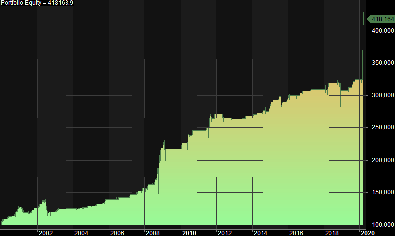 The equity curve since January 2000 looks like this (starting with 100 000 in equity and allocating 100% of equity to every trade, ie. compounding, but taxes are not deducted):
