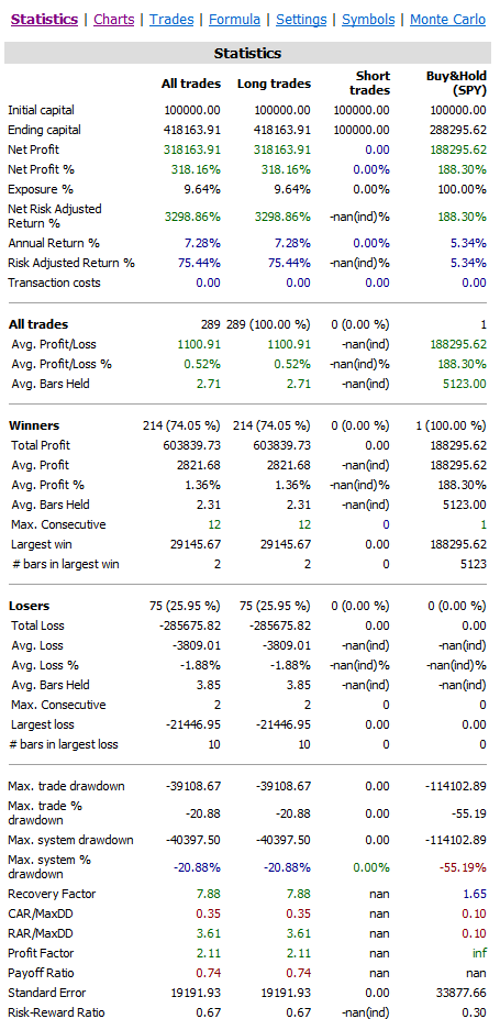 – Before commission, slippage and taxes the strategy generated 7.28% compared to SPY’s buy and hold of 5.34%.