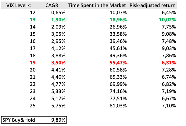 Here is the table showing the results by VIX being below certain thresholds: