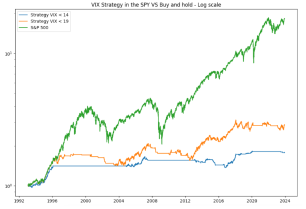 Why might holding the SPY when the VIX is low work? Holding SPY when the VIX is below a certain level can be a good strategy since it indicates that the volatility is very low and the market is stable, contrary to a high VIX level, where there is a lot of volatility and uncertainty.