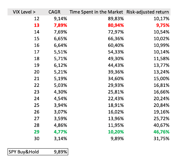 Although the strategy where we hold SPY when the VIX > 13 has a higher CAGR, it spends a lot more time in the market. The risk-adjusted return of the strategy when the VIX > 29 is much higher.