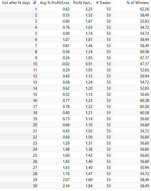 Let’s start by looking at the performance of stocks. If we exit after 1-30 days we get the following table: