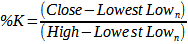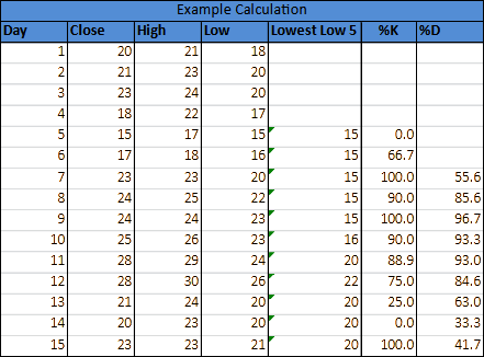 The previous implementation takes the difference between the closing price of day five (15) and the minimum value of Low from the last five days [min(18,20,20,17,15) = 15]; the result is 15-15=0. Then, it subtracts the High of day five (17) minus the minimum value of the variable Low from the last five days (15), yielding 17-15=2. Finally, the division between zero and any number is zero.