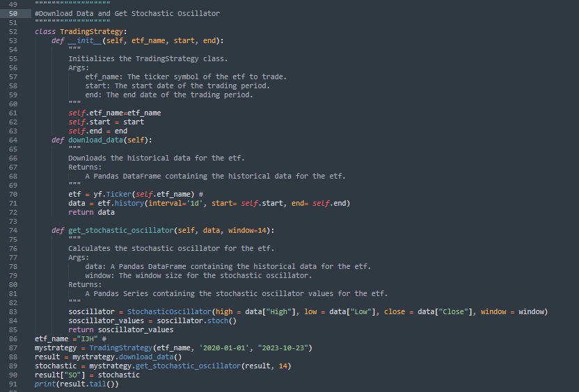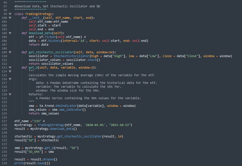 The following image shows the class TradingStrategy with three functions: __init__, download_data, and get_stochastic_oscillator. We initialize the class in TradingStrategy(etf_name, ‘2020-01-01’, “2023-10-23”); next, we implement the download_data function to get result. Subsequently, we use the get_stochastic_oscillator function with parameters data=result and window=14; inside StochasticOscillator and .stoch calculate the values from the stochastic oscillator.