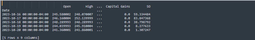 In the previous image, we initialize our class in mystrategy = TradingStrategy(etf_name, ‘2020-01-01’, “2023-10-23”); next, we download the data to obtain result = mystrategy.download_data(); next, we calculate the stochastic oscillator in stochastic = mystrategy.get_stochastic_oscillator(result, 14). Finally, we implement the get_D function with arguments result and “SO”, and we obtain a 3-day moving average using the values from the stochastic oscillator.