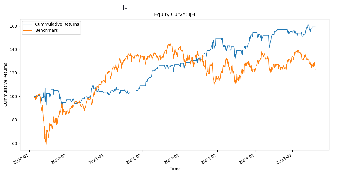 The previous chart shows us the equity curve from our strategy and its benchmark (the ETF); we can see how our strategy started to outperform the IJH ETF in 2022. The total return from our strategy is around 160%. The other important aspect is that our strategy has less volatility.
