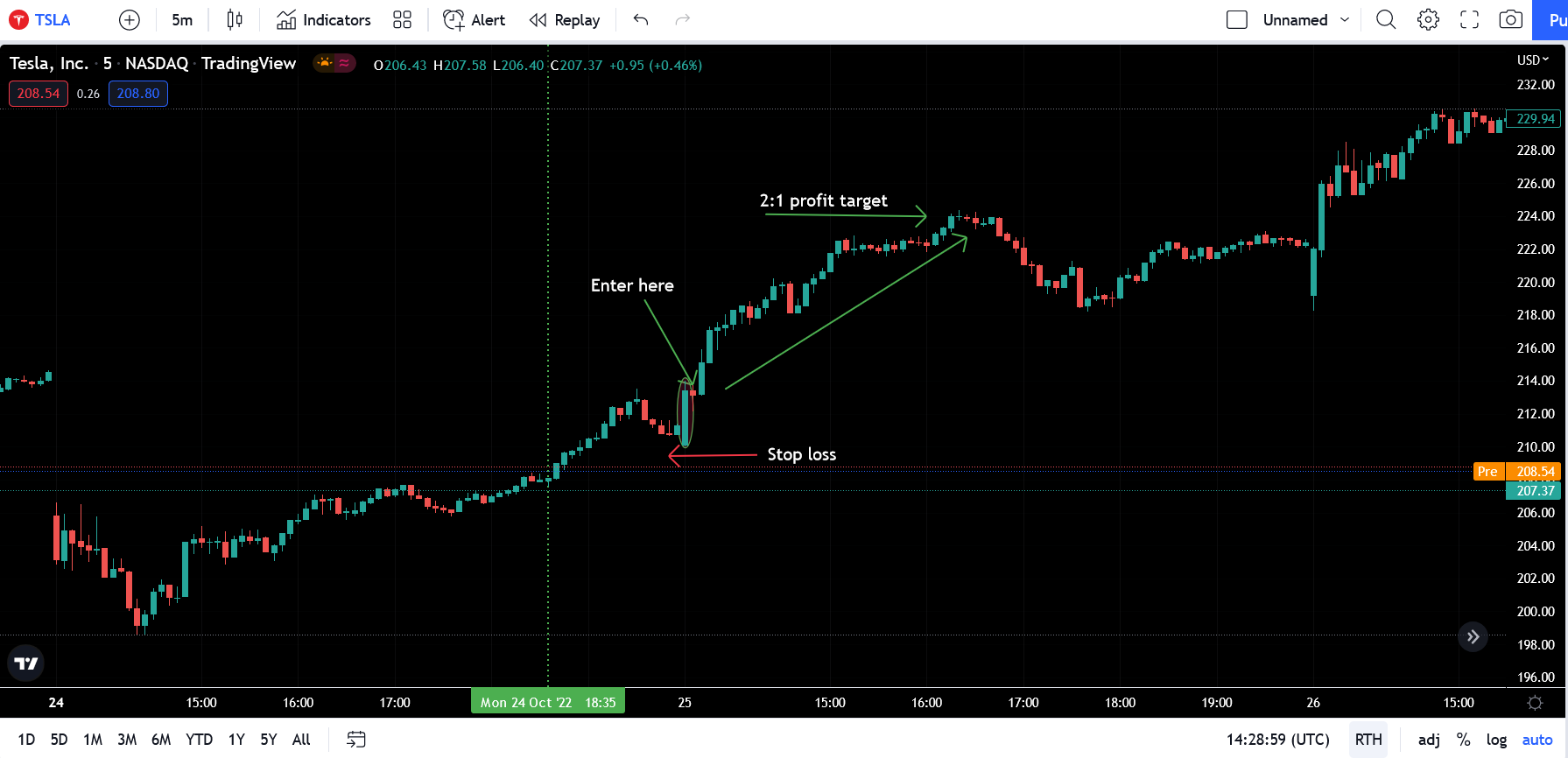 Now, let’s take a look at the second strategy, the OHL strategy. It is a day trading strategy that uses the Open, High, and Low prices of the first five minutes of the trading day to determine a trade entry signal. So, you use the five-minute or 1-minute time frame to trade the strategy. Here is how the signal works: