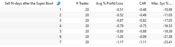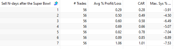Let’s look at the performance if we buy at the close of the first trading day after the Super Bowl final and hold for N-days: