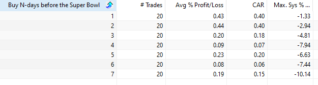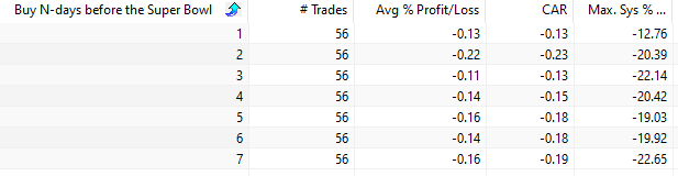 The first backtest looks at the performance of S&P 500 the day before the Super Bowl final: