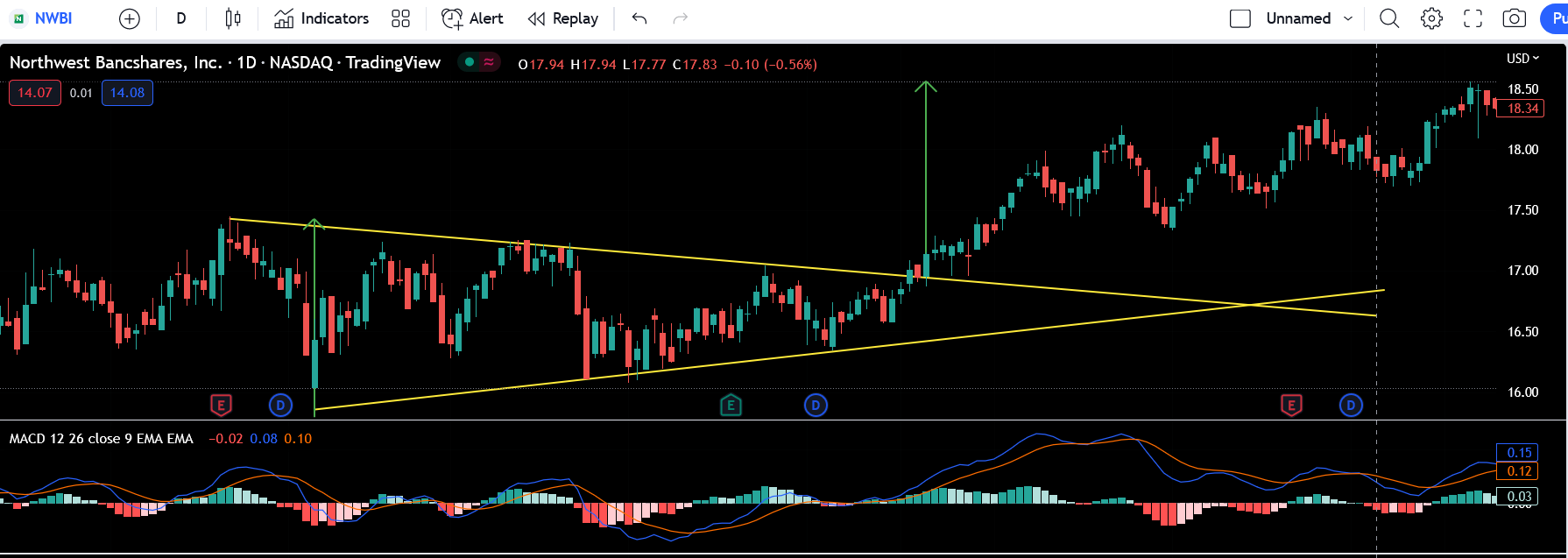 The chart below is that of the Northwest Bancshares stock trading on the Nasdaq exchange. A symmetrical triangle formed as you can see from the yellow trendlines marking the upper and lower boundaries. Notice how the price rose steadily after the breakout to the upside.
