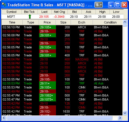 Rows of data are frequently color-coded to indicate whether the trade occurred on, within, or outside the bid or ask. Many trading platforms now allow investors to customize the display of time and sales data by adding price or volume filters, for example. Here is an example of a level 2 window: