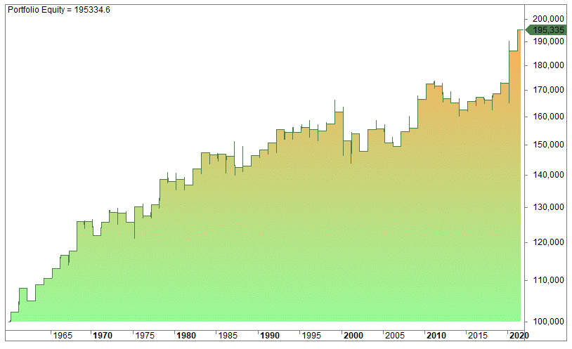 If we enter at the close of the first trading day after the tax file deadline and sell at the close of April, we get this equity curve: