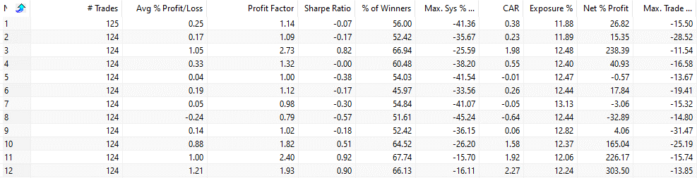 The first column shows the month. For example, 3 means we buy at the close of March and sell on the 15th of April (thus number 3 is April and 12 is January). As you can see, April is the best month!
