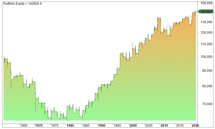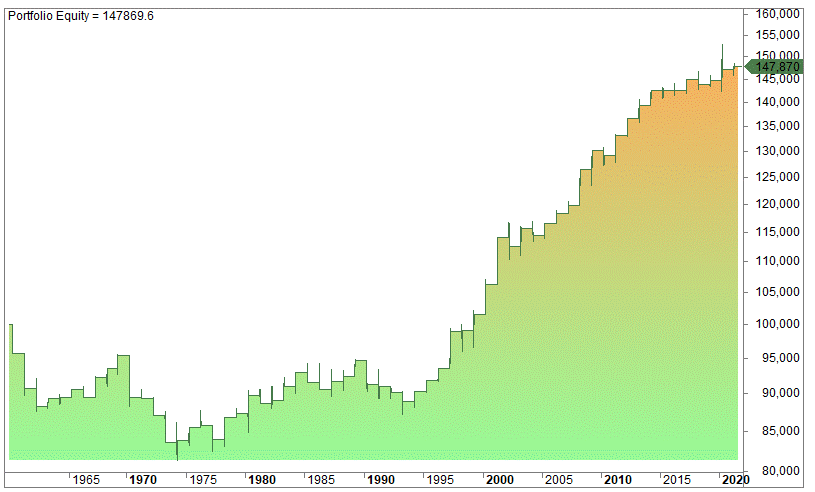If we enter at the close of the first trading day after the tax file deadline and sell at the close of April, we get this equity curve: