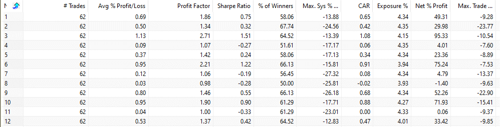 The first column shows the month. For example, 3 means we buy at the close of March and sell on the 15th of April (thus number 3 is April and 12 is January). As you can see, April is the best month!