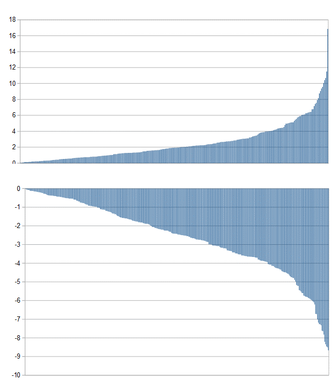 The chart above shows the 15-day ATR (average true range) which cools off dramatically after March 2003 when the market bottomed. Markets sell off “spectacularly” but rise slowly.