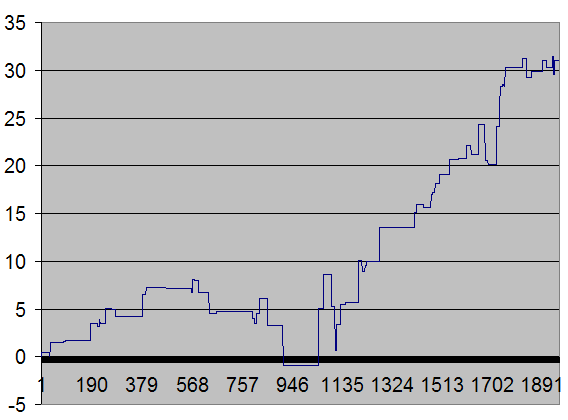 However, setting a higher max on the (c-l)/(h-l) criteria gives a bit more erratic picture. With this indicator set at max 0.33 we get this equity chart: