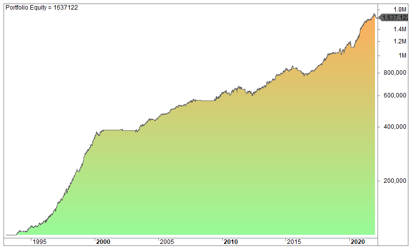 This is the equity curve since 1993 if you bought every close and sold at the open the next day: