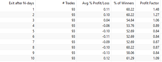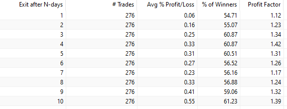 Trading performance if we exit after N-days since SPY’s inception in 1993: