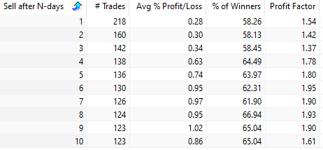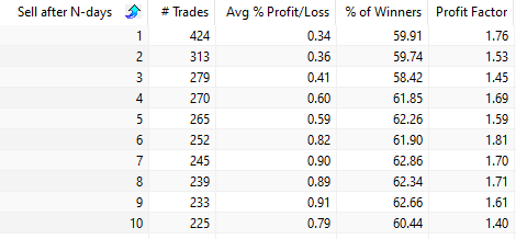Trading performance if exit after N-days (SPY since inception in 1993):