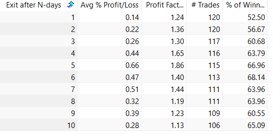 Trading performance if exit after N-days (SPY since 1993):