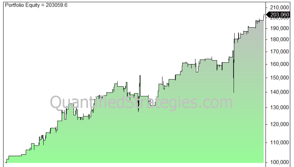If we sell (exit) after 5 trading days we get the following equity curve: