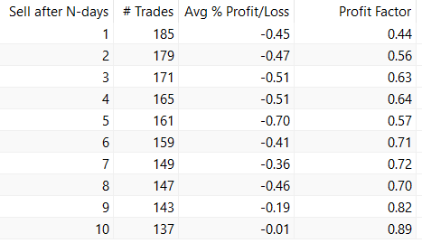 This is how the equity curve looks like if we exit after one trading day: