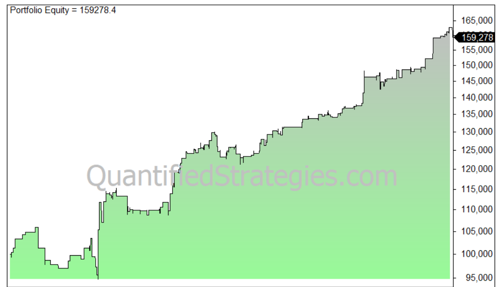 If we exit after 2 trading days we get the following equity curve: