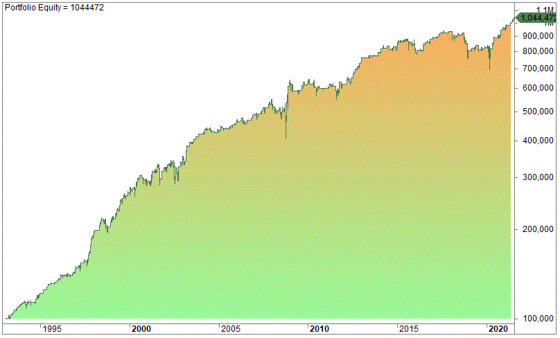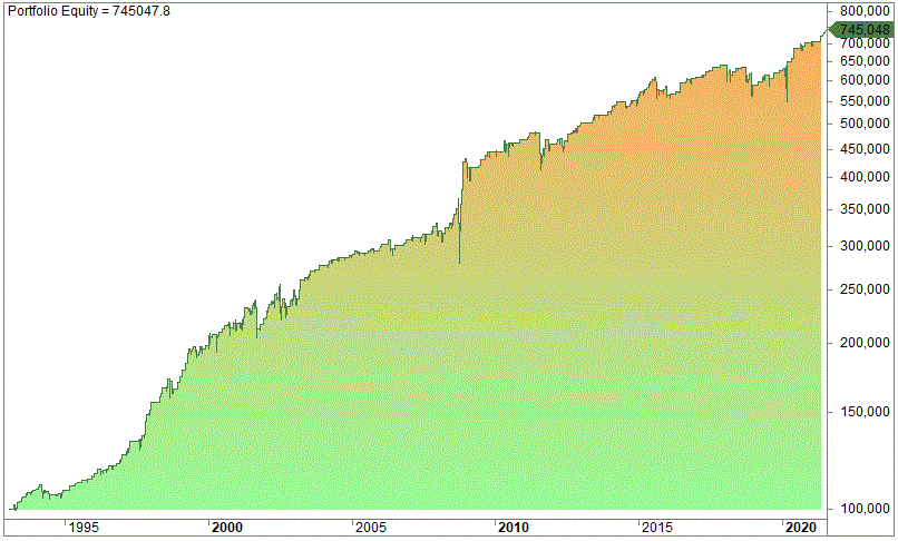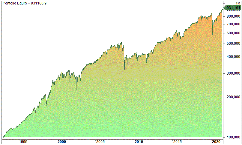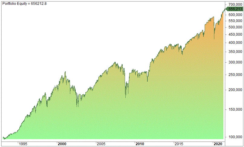 When simulating this trading strategy you can employ the “opposite” sell signal: sell when the two-day RSI is above 90. If you backtest this on the S&P 500 since 1993 on the oldest ETF around (SPY) you get this equity curve if you invested 100 000 and compounded/reinvested until September 2021: