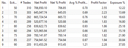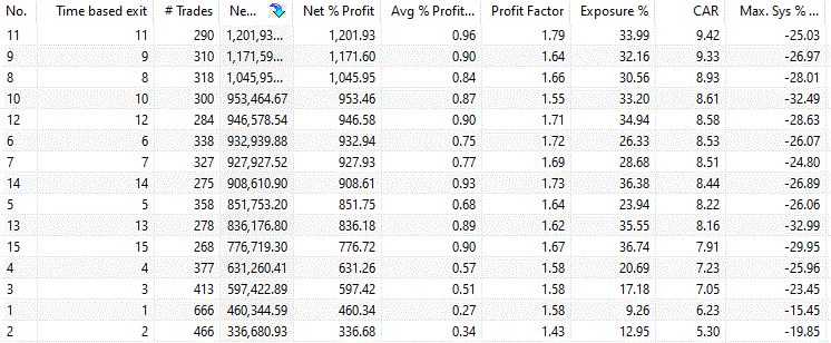Column two shows the different exits in bars after entry. The table shows that the strategy improves by using a time-based exit between 8 and 10 days. Not only is the profits bigger, but the max drawdowns are reduced significantly.