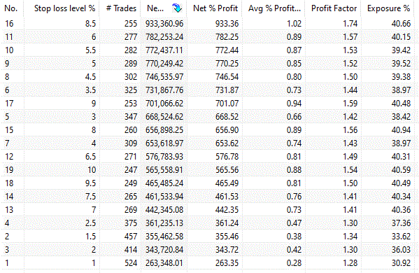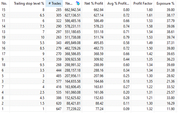 Column two shows the different trailing stops in %. The best trailing stop level is at 8%, but total profits are far inferior to the original strategy without stops at all.