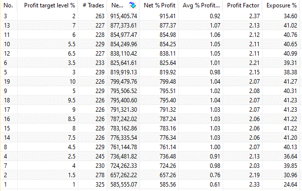 The second column shows the different levels of profit target: from 1 to 10% with 0.5% intervals. There are no other stops. Yet again the total profits don’t manage to beat the original strategy for any of the target levels. Max drawdown was for all levels between 30 to 40%, more or less in line with the original strategy.
